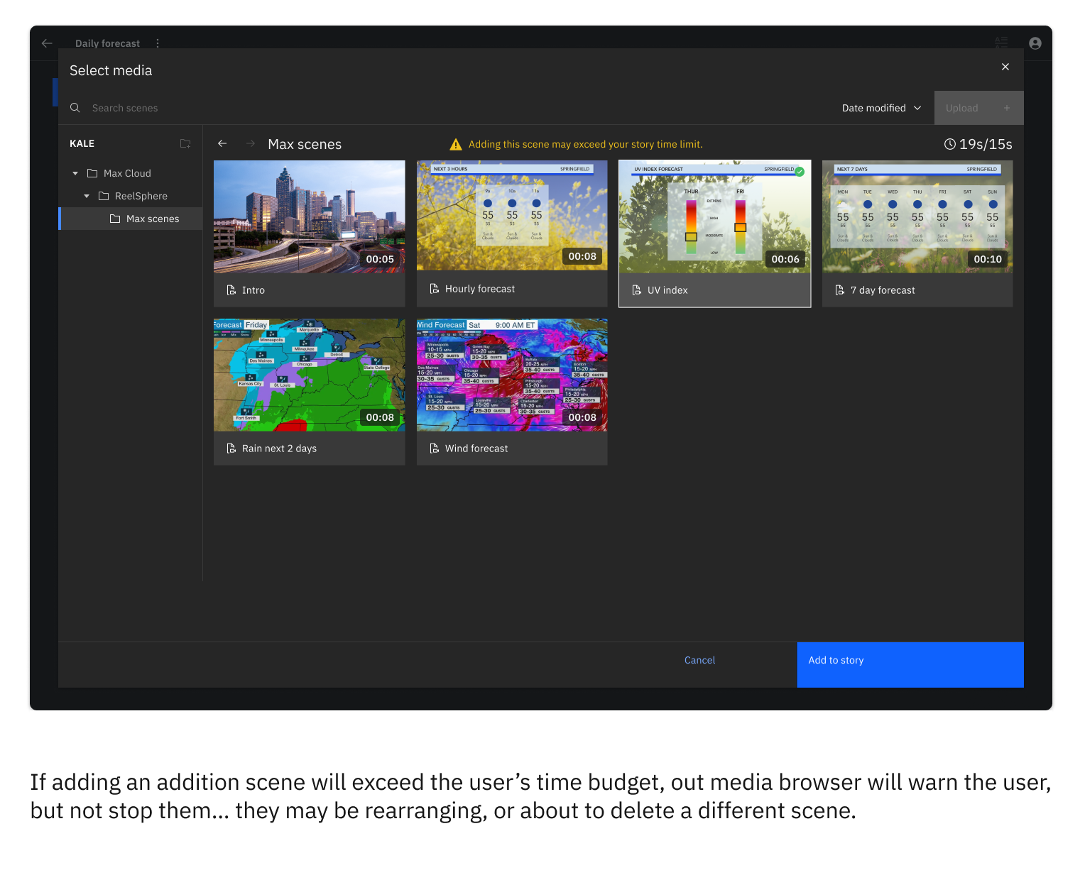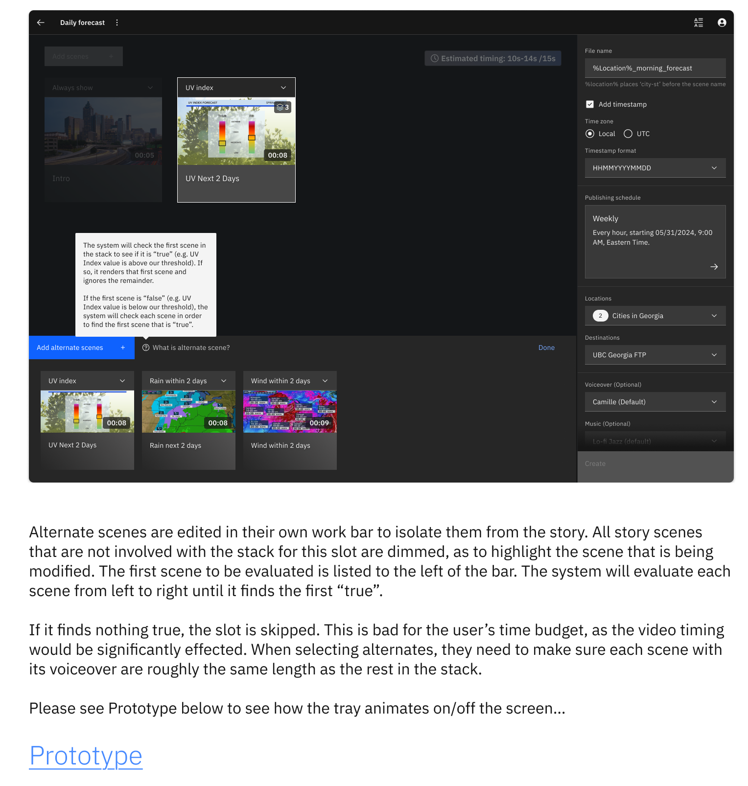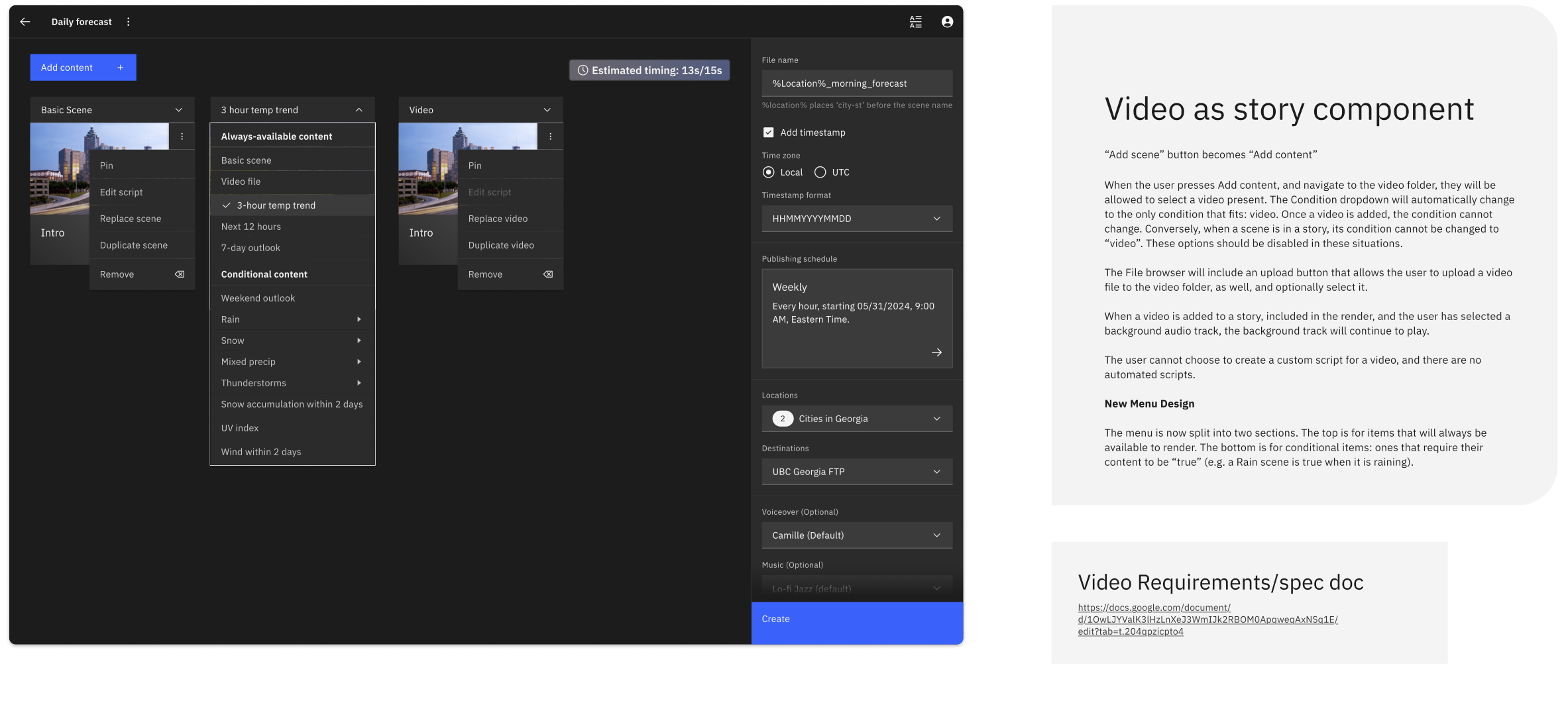 With the problem validated, version 1 focused on letting users create stories from an existing library of Max scenes and variables that are then scheduled to auto-publish. At publication time, ReelSphere dynamically chooses the appropriate scenes based on each location’s current weather data, updates the graphics, and adds a pre-written, descriptive text for each scene. These are the same top-quality insights used on TWC’s weather.com and The Weather Channel apps. The script can be manually augmented or completely overwritten by a meteorologist and then synthesized with a customizable AI voice.